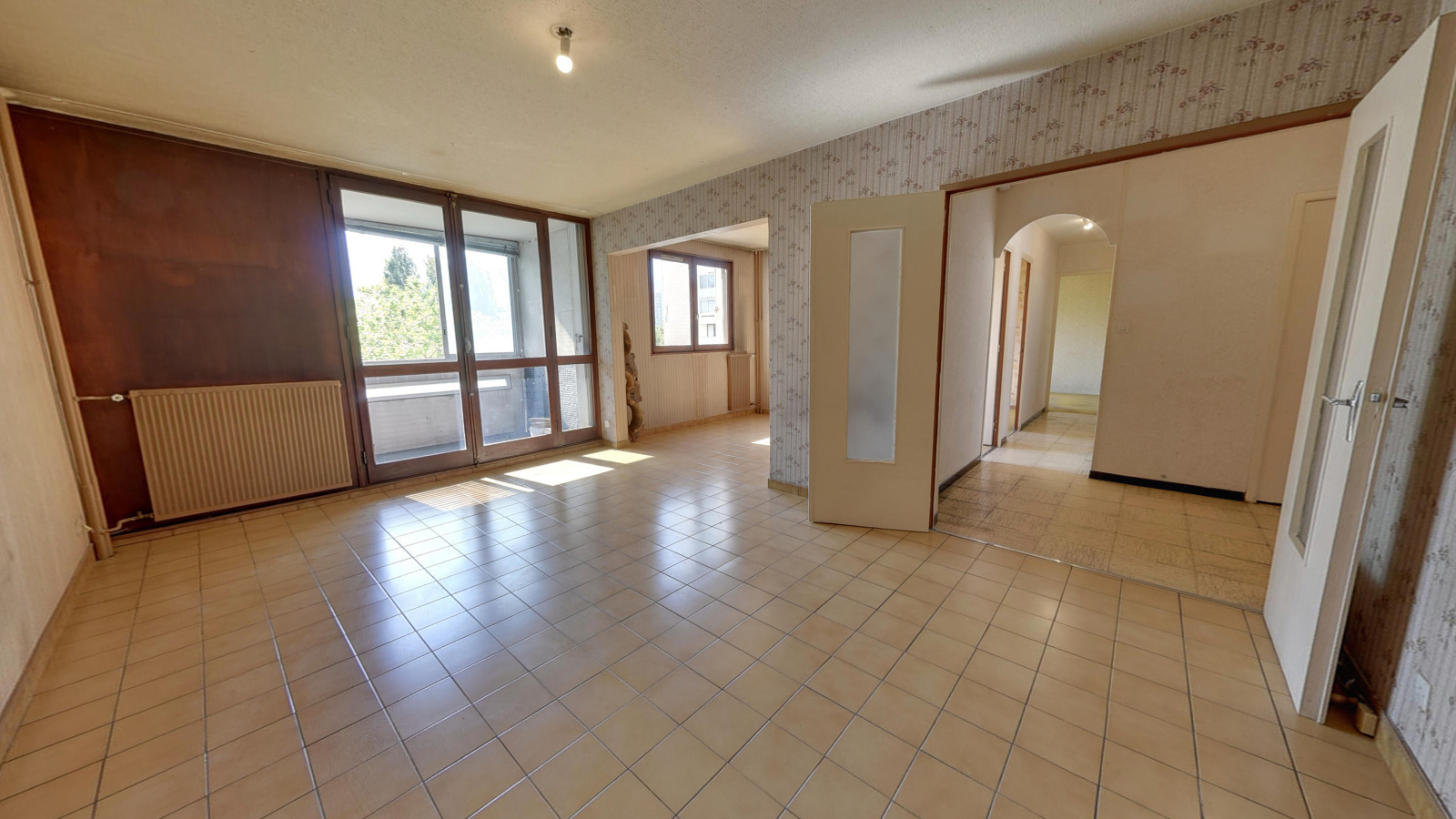 Échirolles (38130)Au 3ème étage sur 15, dans une copropriété de 189 lots principaux bien tenue, cet appartement de 4 pièces + cuisine est à rénover. Exposé Sud et Ouest, sans vis à vis et donnant dans la verdure, le séjour est double et ouvre sur un balcon fermé. Il est également composé d'une cuisine séparée avec loggia, d'une salle de bain avec un espace buanderie, et d'un grand dressing et toilette séparé, ainsi que de 2 chambres (possibilité de recréer la 3ème). Vendu avec une cave. Les charges annuelles prévisionnelles sont de 1916€, chauffage et eaux compris.