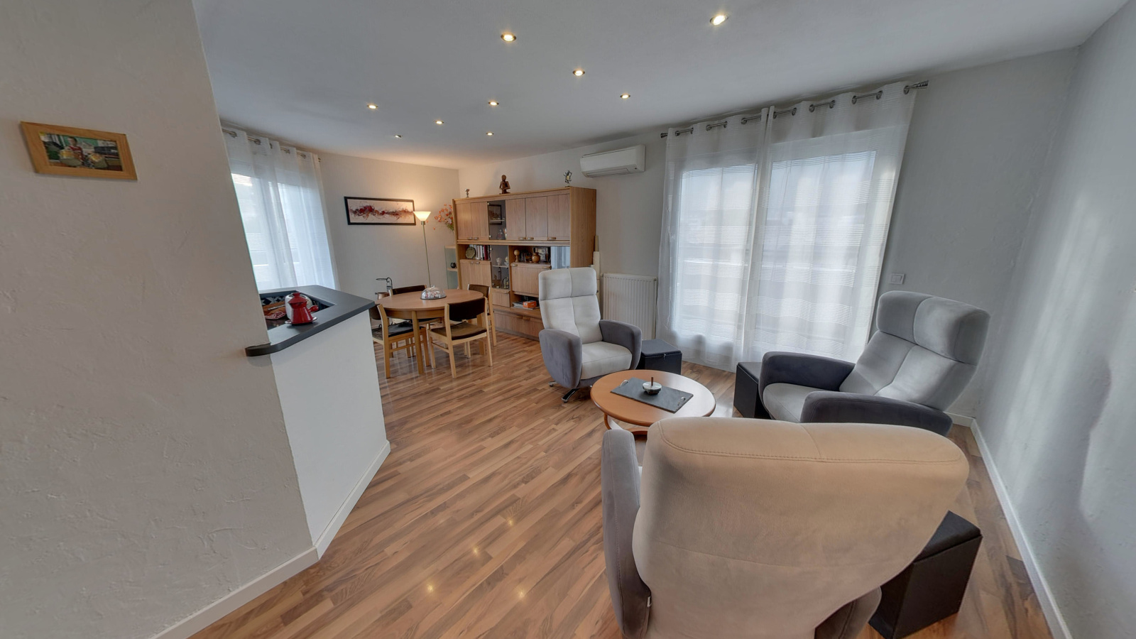 Échirolles (38130)En 3ème et dernier étage avec ascenseur, coup de coeur pour ce bel appartement de 86m² de 4 pièces + cuisine, situé dans une petite résidence de standing ravalée en 2018. Il se compose d'un espace vie de 36,50m² avec le séjour ouvert sur la cuisine équipée, offrant un accès à la terrasse exposée Sud / Est / Ouest de 47m² . 3 chambres dont deux avec rangements, et disposant toutes d'un accès extérieur, ainsi qu'une salle d'eau récente, complètent l'ensemble. Equipé d'une climatisation reversible, il bénéficie de volets électriques dans toutes les pièces. Les peintures sont récentes. Ce bien est vendu avec une possibilité de garage en sous sol en sus du prix (15 000€). Dans une copropriété calme de 27 lots principaux, les charges annuelles prévisionnelles sont de 3208€, comprenant le chauffage, l'eau chaude et l'eau froide.