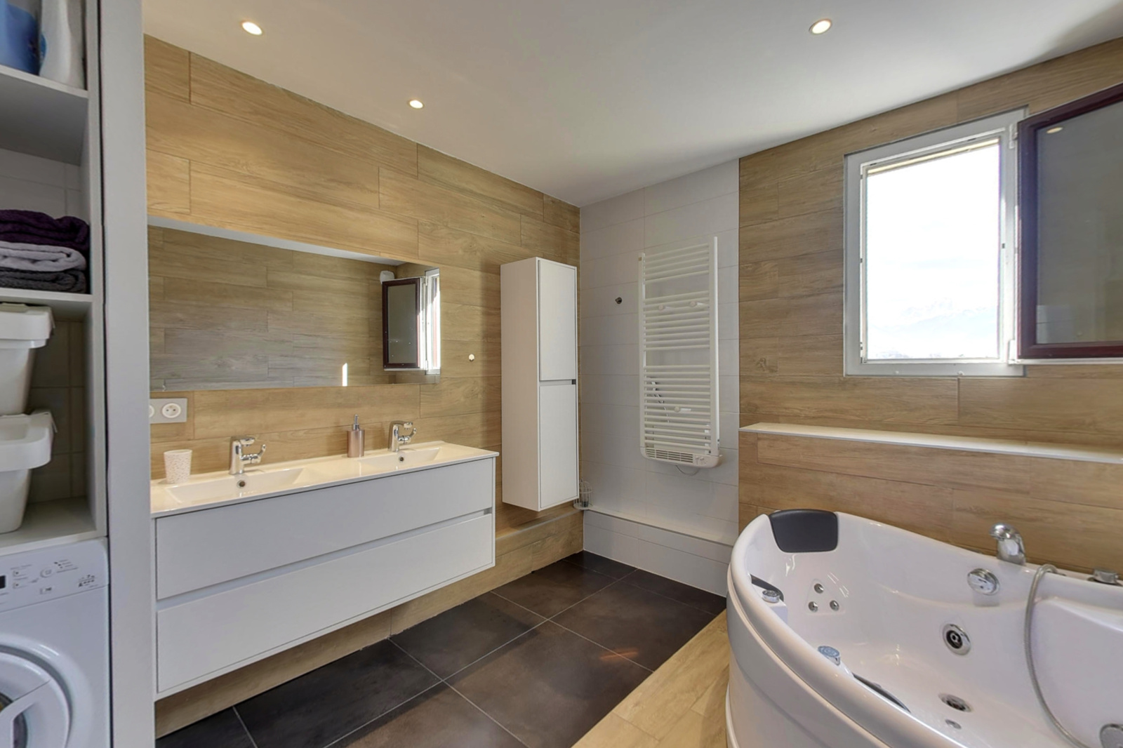 Les teintes de bois clair mariées au carrelage sombre en dalles 60/60 et aux parquets dans les chambres confèrent une atmosphère chaleureuse à l'ensemble de l'appartement. Le visiter vous permettra de vous rendre compte du soin apporté aux finitions et aux matériaux, en bref d'avoir le coup de coeur pour ce bien rare à la vente !