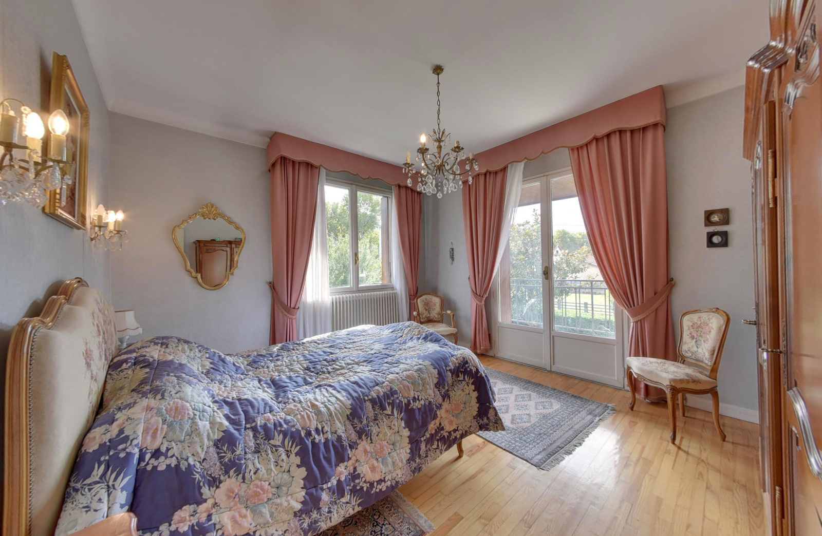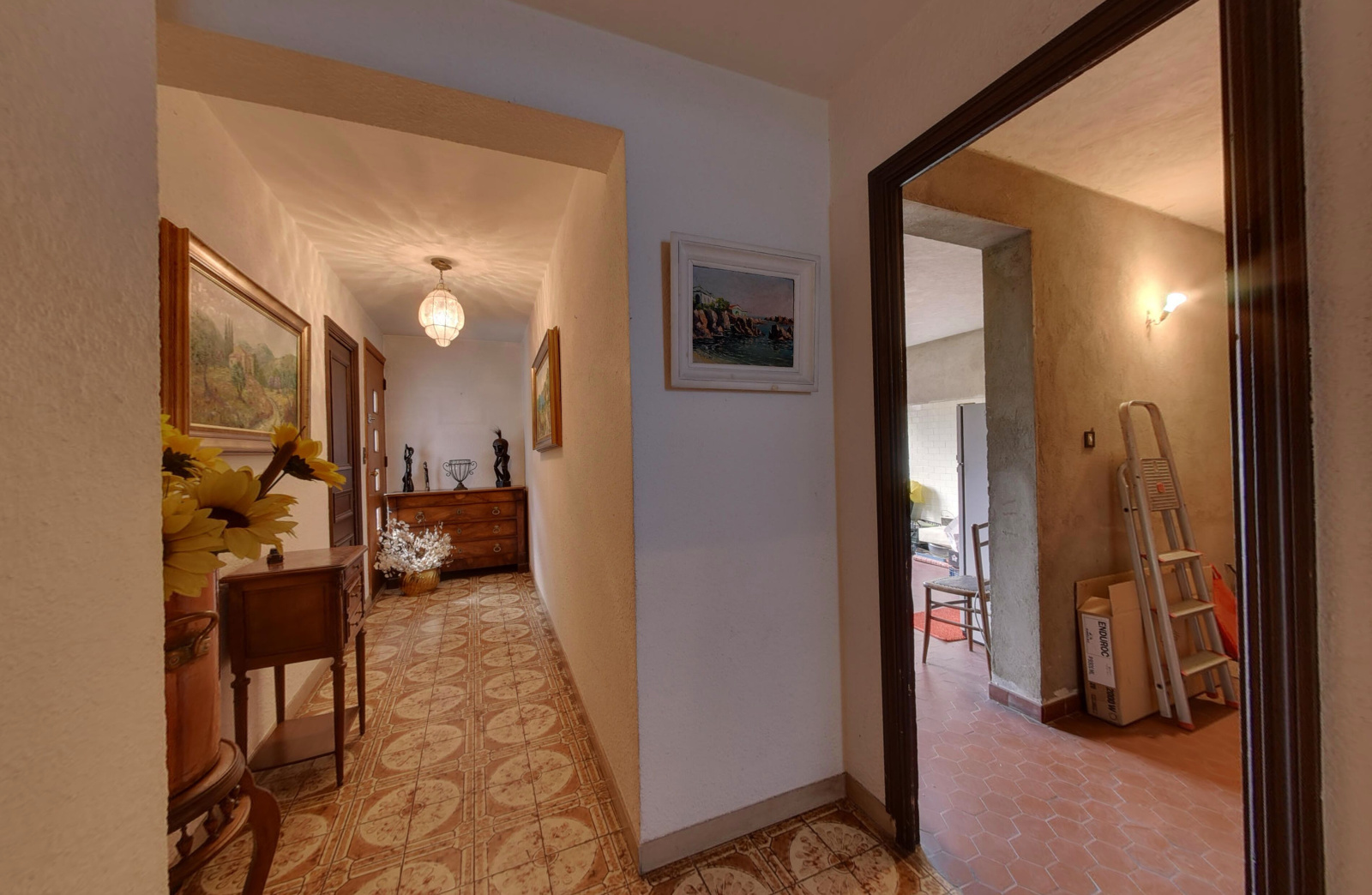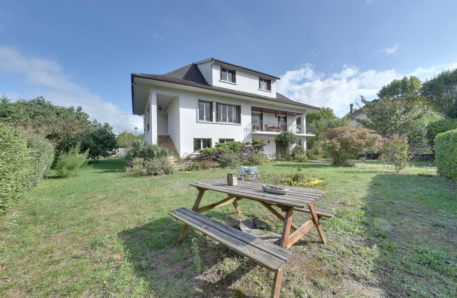 A l'étage, elle bénéficie d'un beau séjour avec une cheminée d'angle ouvrant, ainsi que la cuisine, sur une terrasse Sud, et de 3 chambres, pour une surface de 104m².