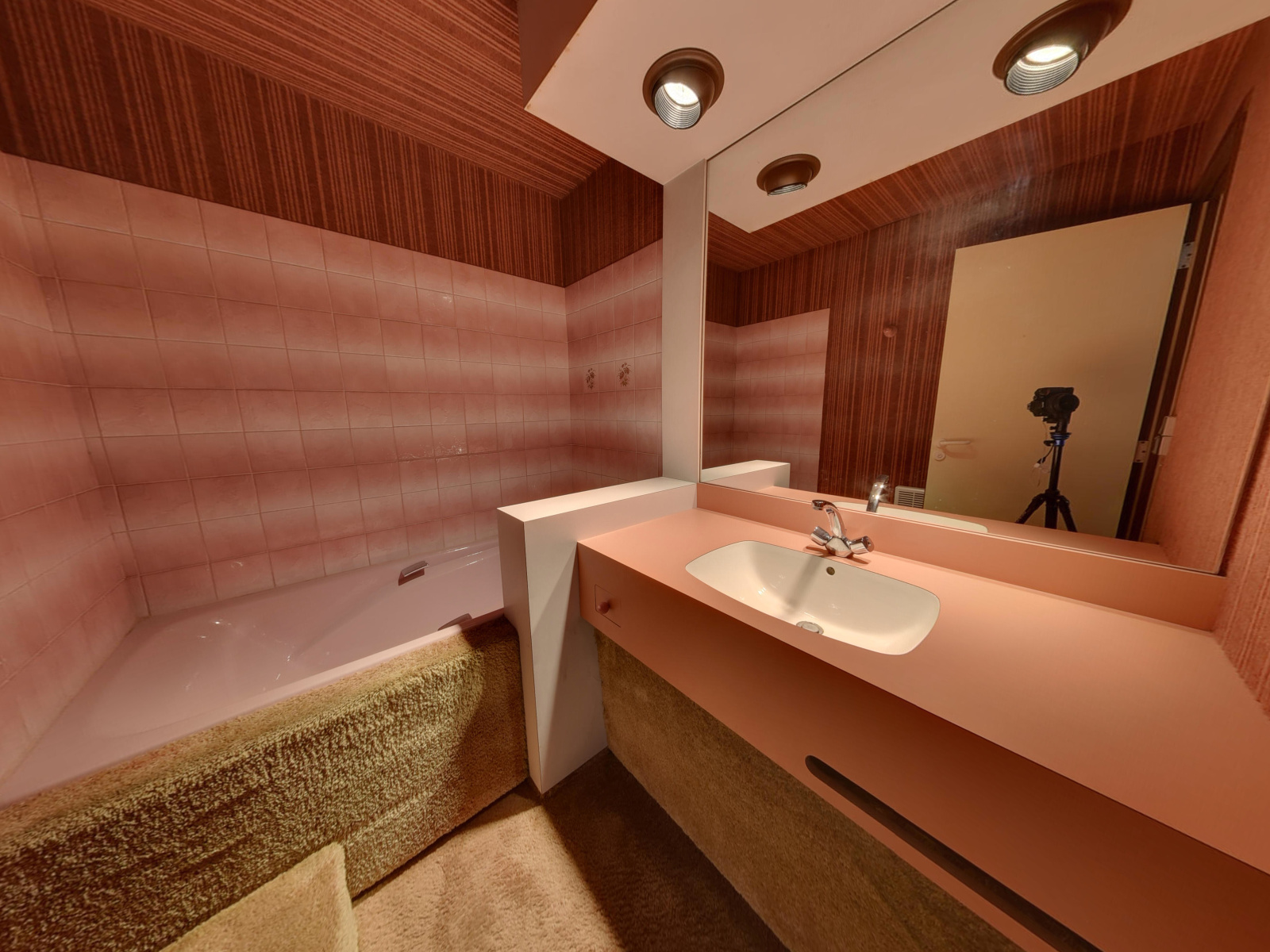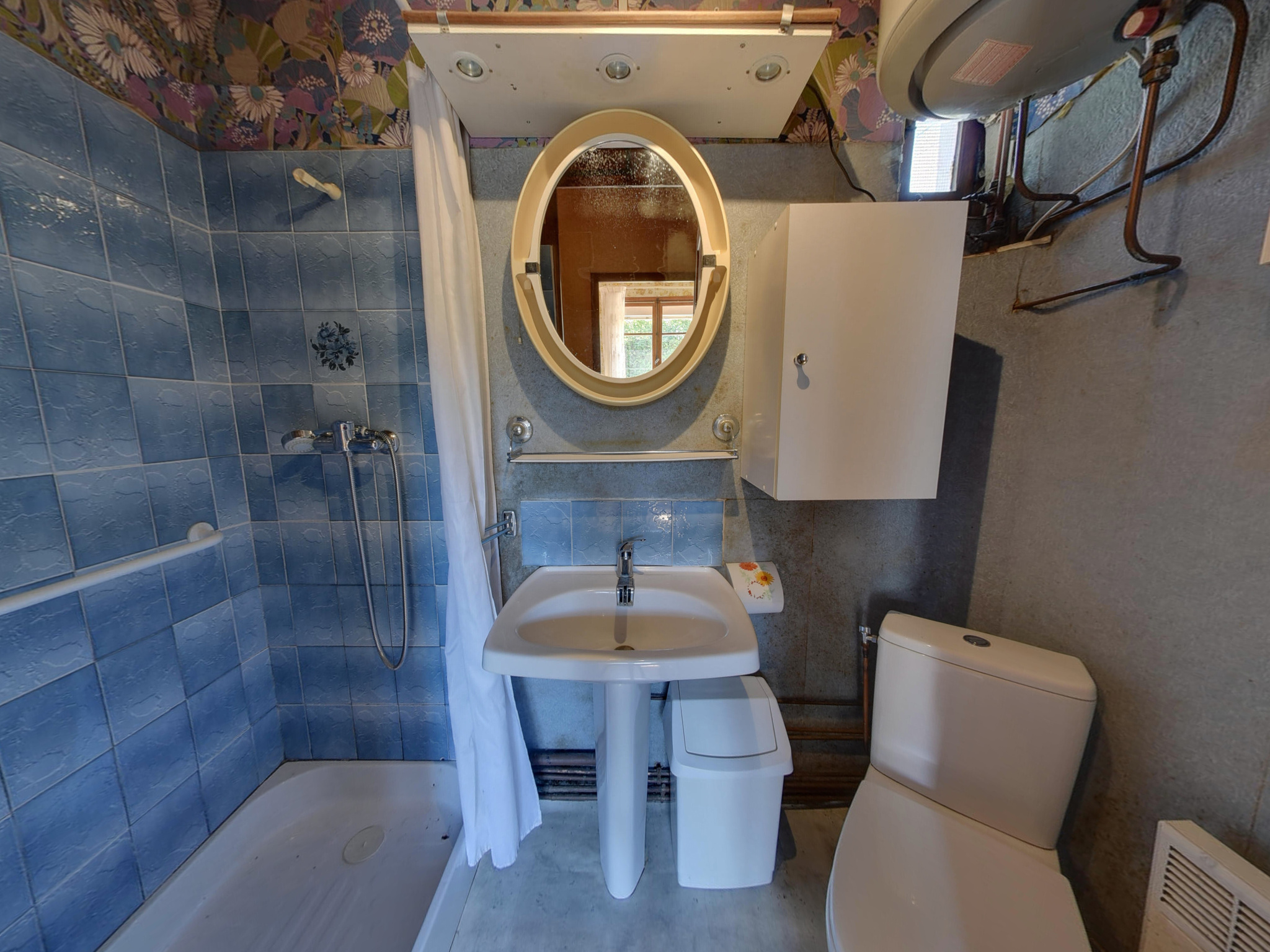 La maison se compose comme suit : de plain pied, un séjour/cuisine de 23m², une grande chambre avec rangement, une salle d'eau avec les toilettes inclus. En demi-niveau, une seconde chambre d'environ 23m² avec une salle de bain attenante.