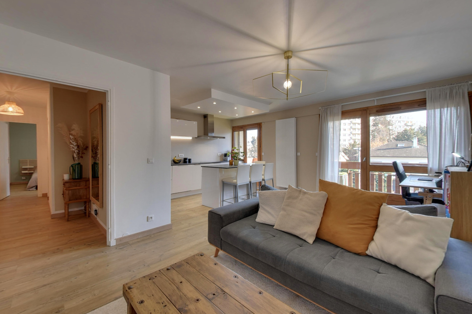 Gières (38610)Dans la copropriété ravalée et fermée "les Tilleuls", au 2ème étage sur 3, bel appartement de 2 pièces + cuisine de 60m² environ. Rénové récemment de façon soignée et contemporaine, il offre un espace vie ouvert de 31m² avec une cuisine équipée, donnant sur un large balcon avec une vue sur les massifs sans vis à vis. Très bien conçu, bénéficiant de nombreux rangements, les volets roulants sont électriques, la chaudière gaz est récente, le tableau électrique également. Vendu avec un parking privatif, les charges annuelles prévisionnelles sont de 1044€.