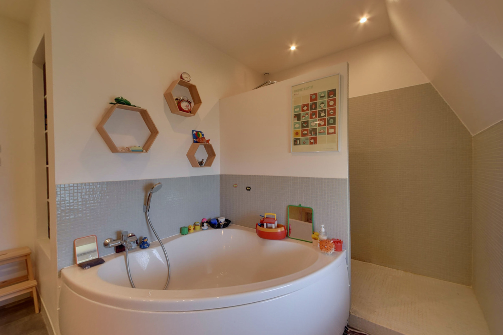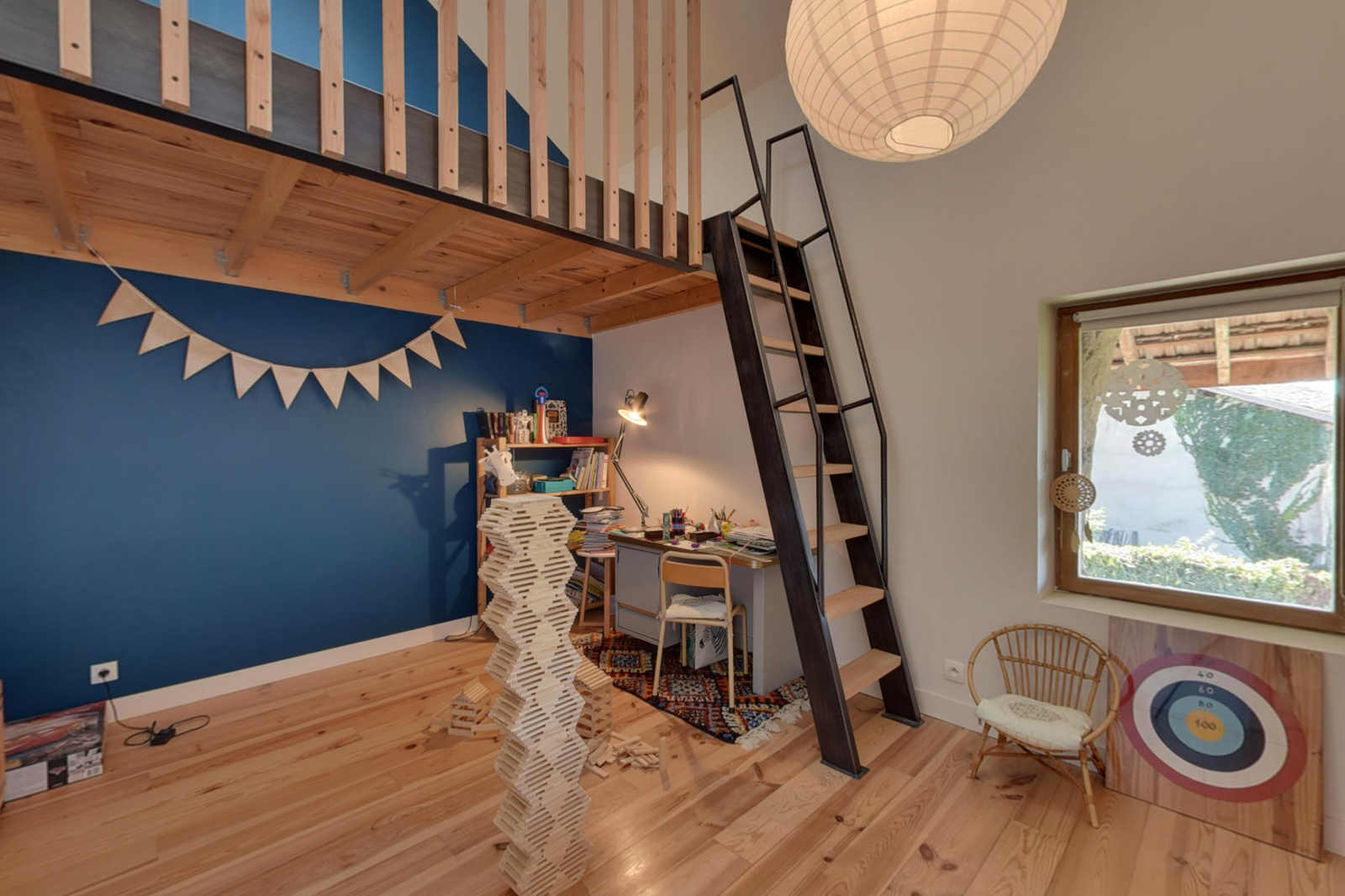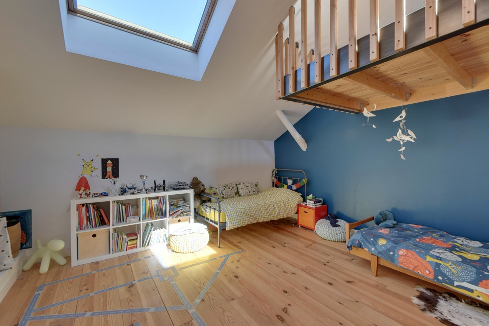 L'étage se compose d'une première chambre, d'un espace ouvert, actuellement utilisé comme chambre avec un grand linéaire de rangement, et deux chambres d'enfants avec rangements reliées entre elle par une mezzanine commune très joliment réalisée en métal et bois. Pour finir, le dégagement offre de nombreux rangements, la salle de bains accueille une double vasque, une baignoire d'angle et une douche à l'italienne. Des toilettes suspendus avec lave mains complètent l'étage. Garage attenant de 40m2 env. Maison coup de coeur à découvrir absolument !