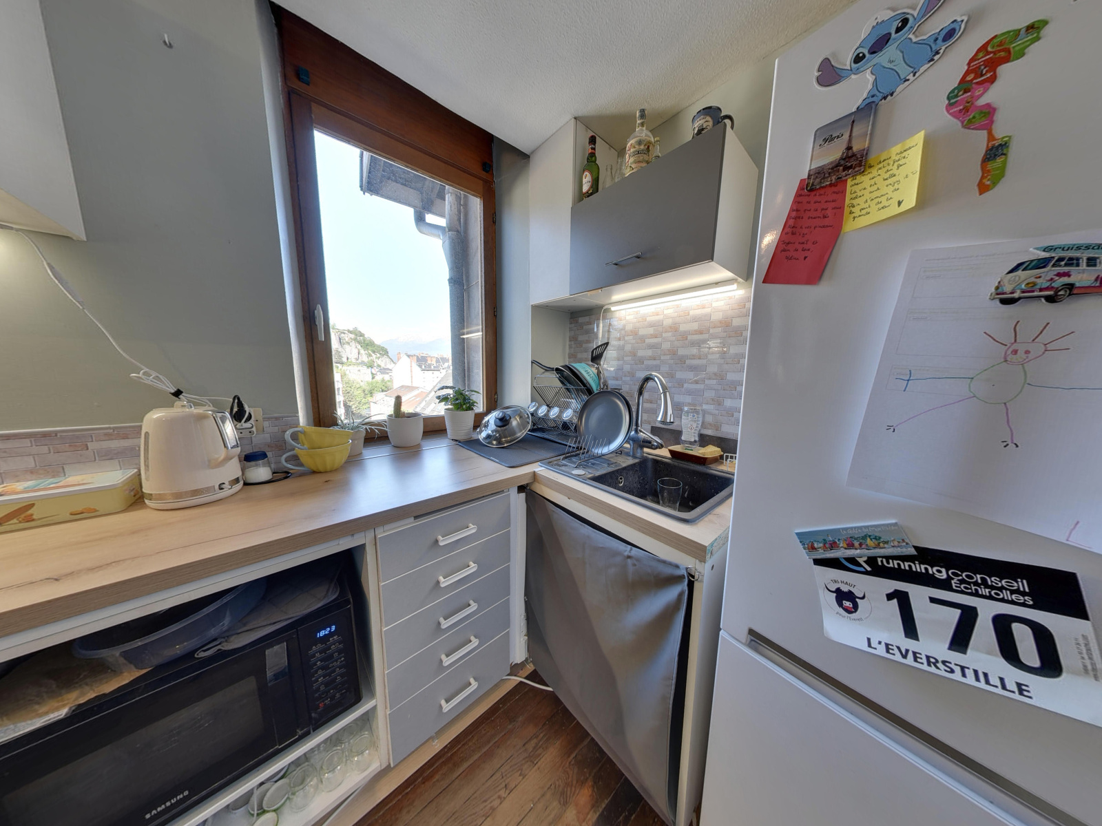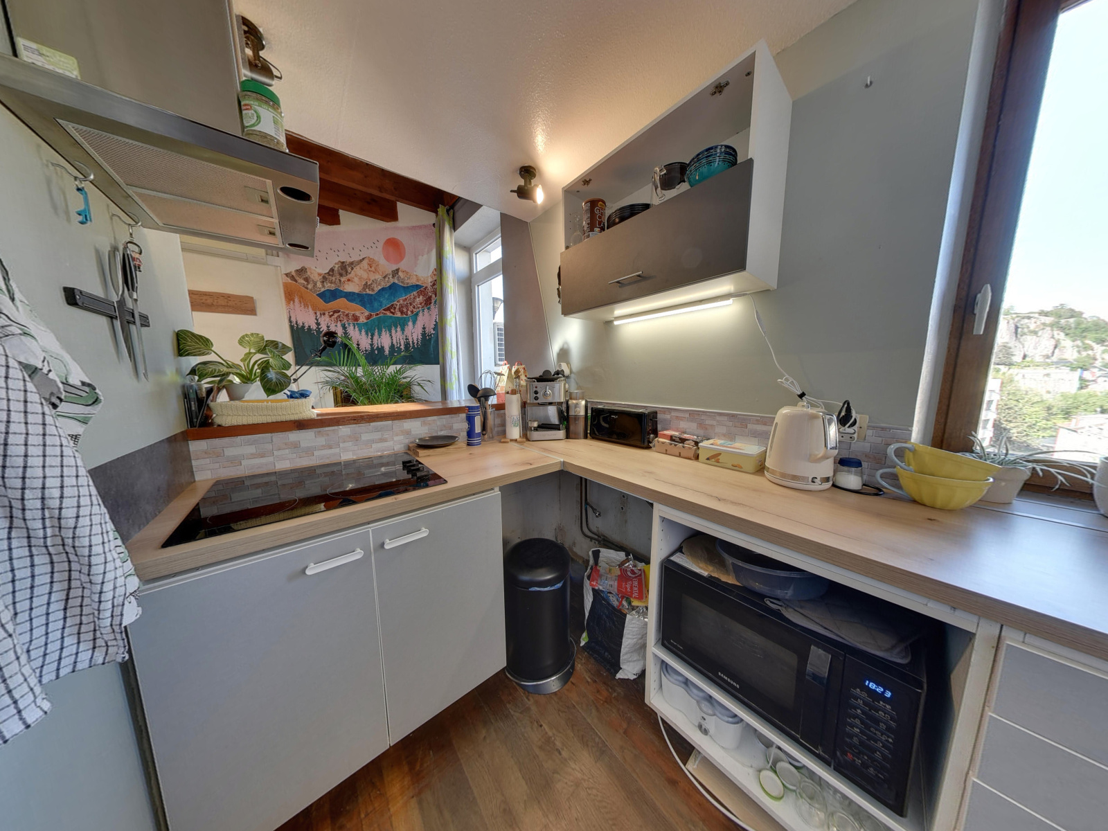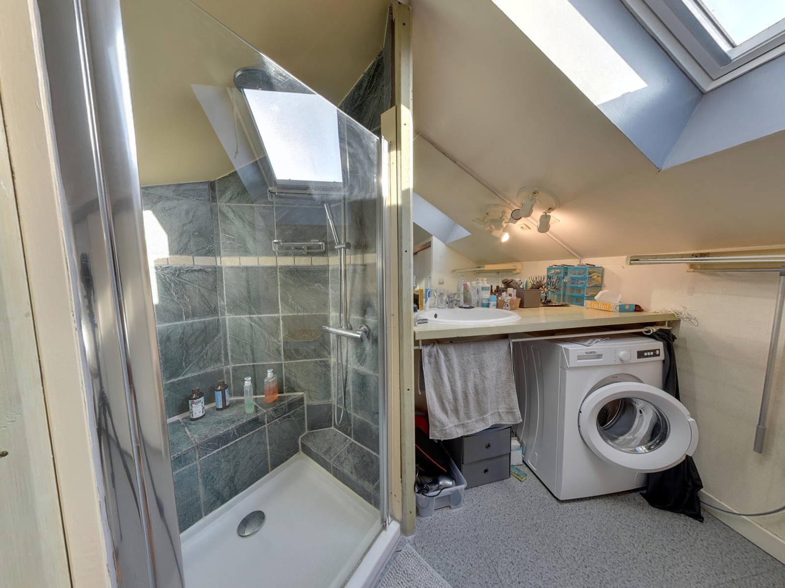 D'une superficie de 33,19m² carrez et de 56,14m² utiles, il a été traité comme un loft. Il offre un espace vie de 27m² comprenant la cuisine partiellement équipée, le salon ainsi que la salle à manger, ouvrant sur un balcon exposé Est avec une vue panoramique sur les massifs de la Chartreuse et de Belledonne. Au dessus, la partie en sous-pente accueille une salle de douche, la buanderie et un coin nuit pour 26m² utiles.