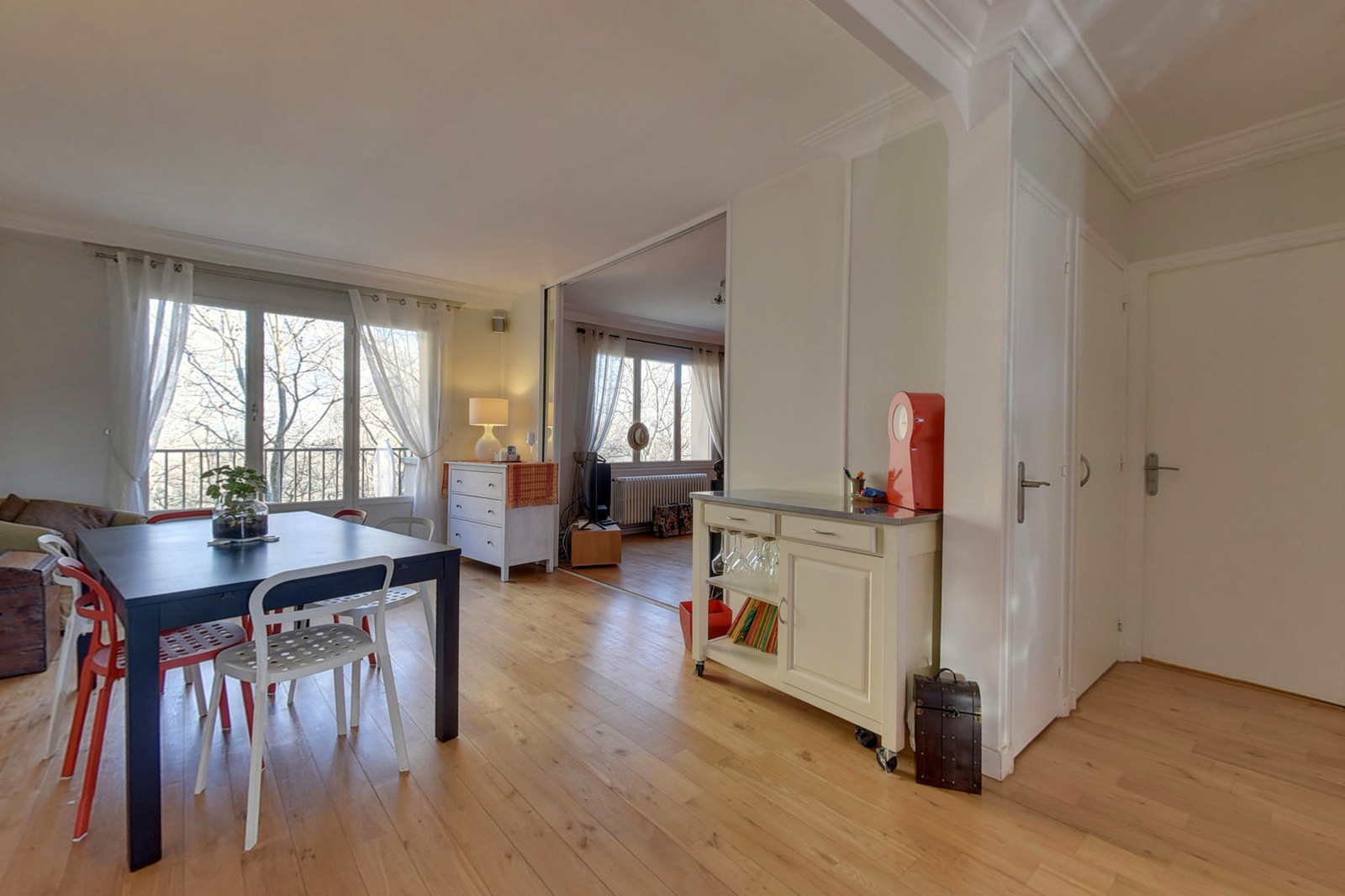 Grenoble (38000)Grenoble Chavant, beau et vaste 3 pièces + cuisine traversant de 79 m², en étage elevé avec ascenseur. Offrant de belles prestations et de beaux volumes, il dispose d'une cuisine équipée ouverte sur séjour ainsi que de 2 belles chambres de 15 m². 2 balcons avec vue dégagée, une cave, ainsi qu'une possibilité de garage en location complètent l'ensemble. Situé dans une copropriété cossue de 55 lots principaux avec gardien, les charges annuelles prévisionnelles sont de 1700 euros, chauffage compris.